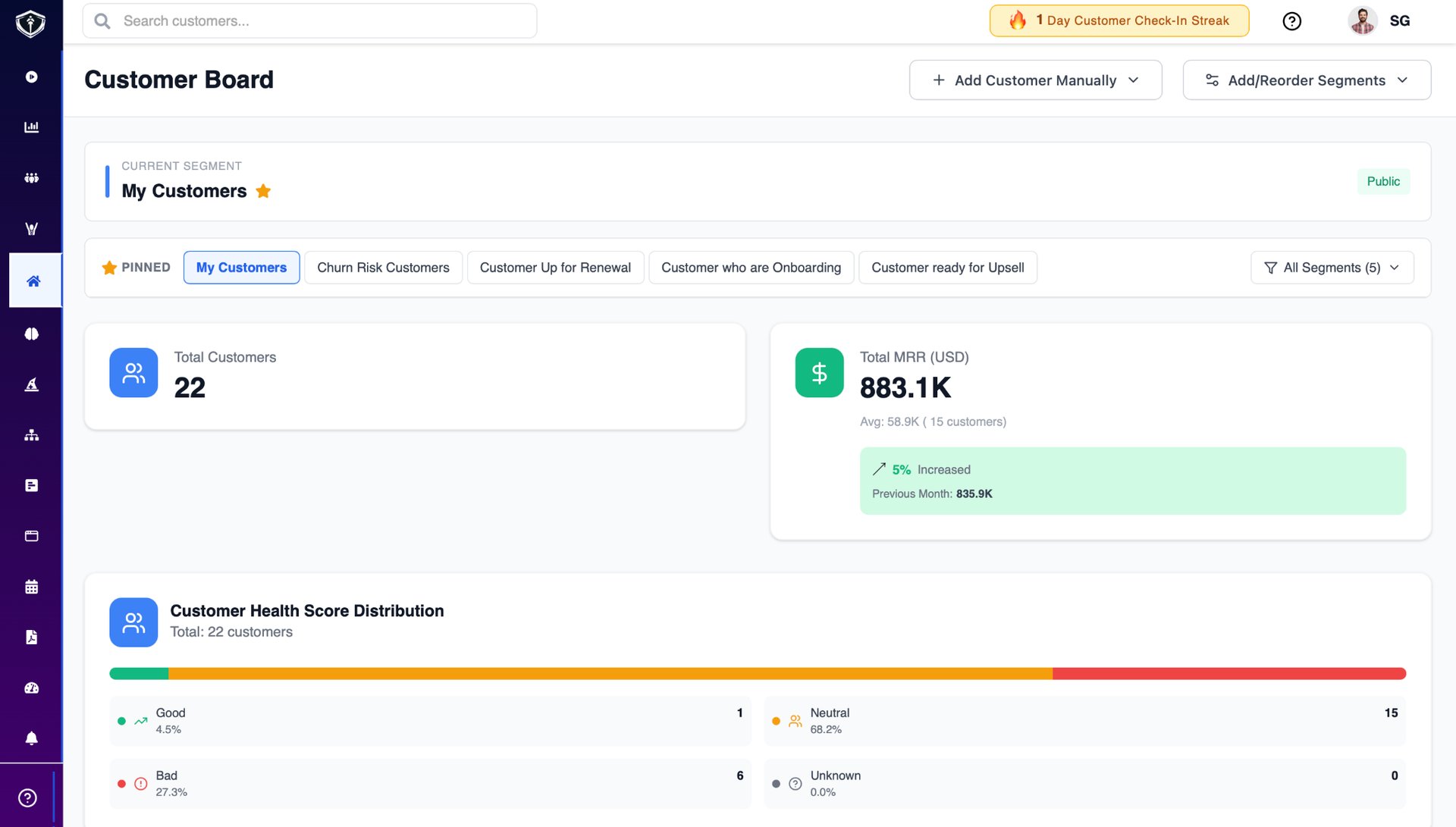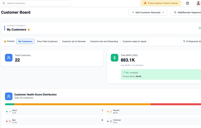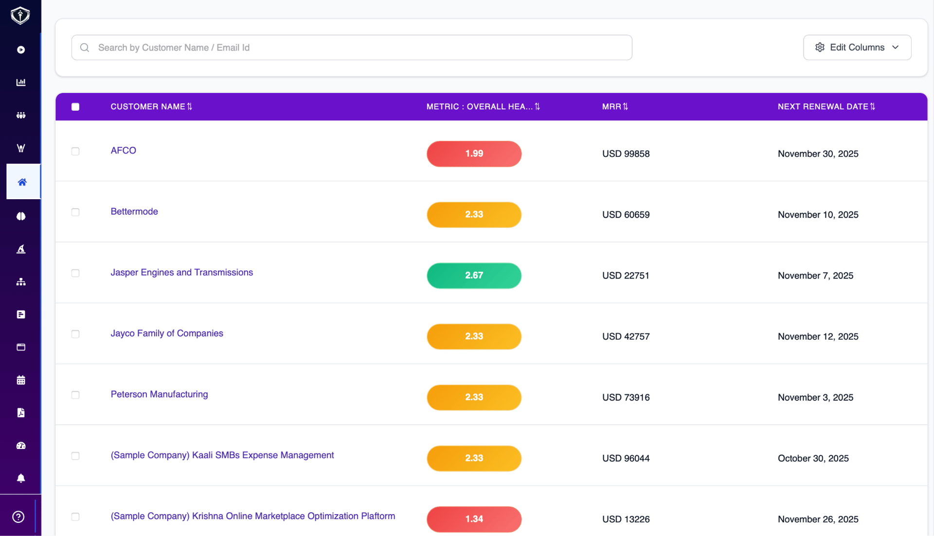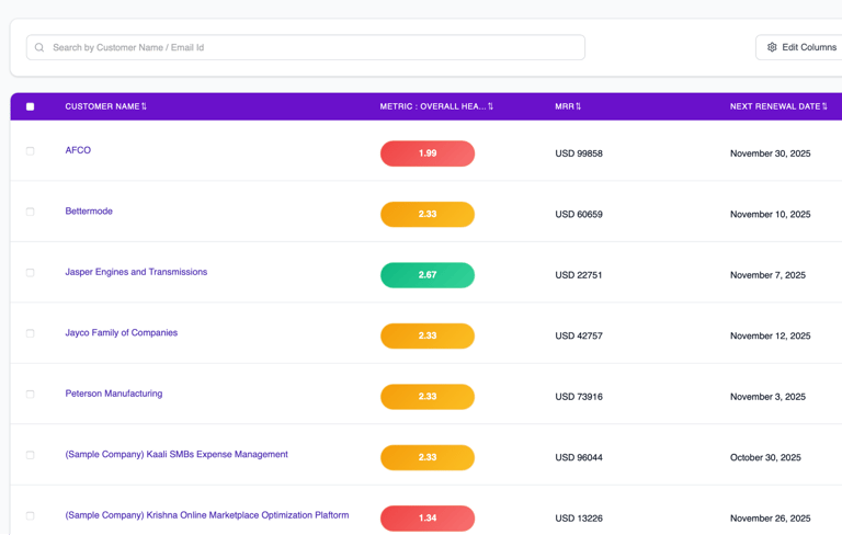 Identify at-risk accounts early by monitoring various customer health indicators, enabling proactive engagement and intervention to prevent churn or dissatisfaction.